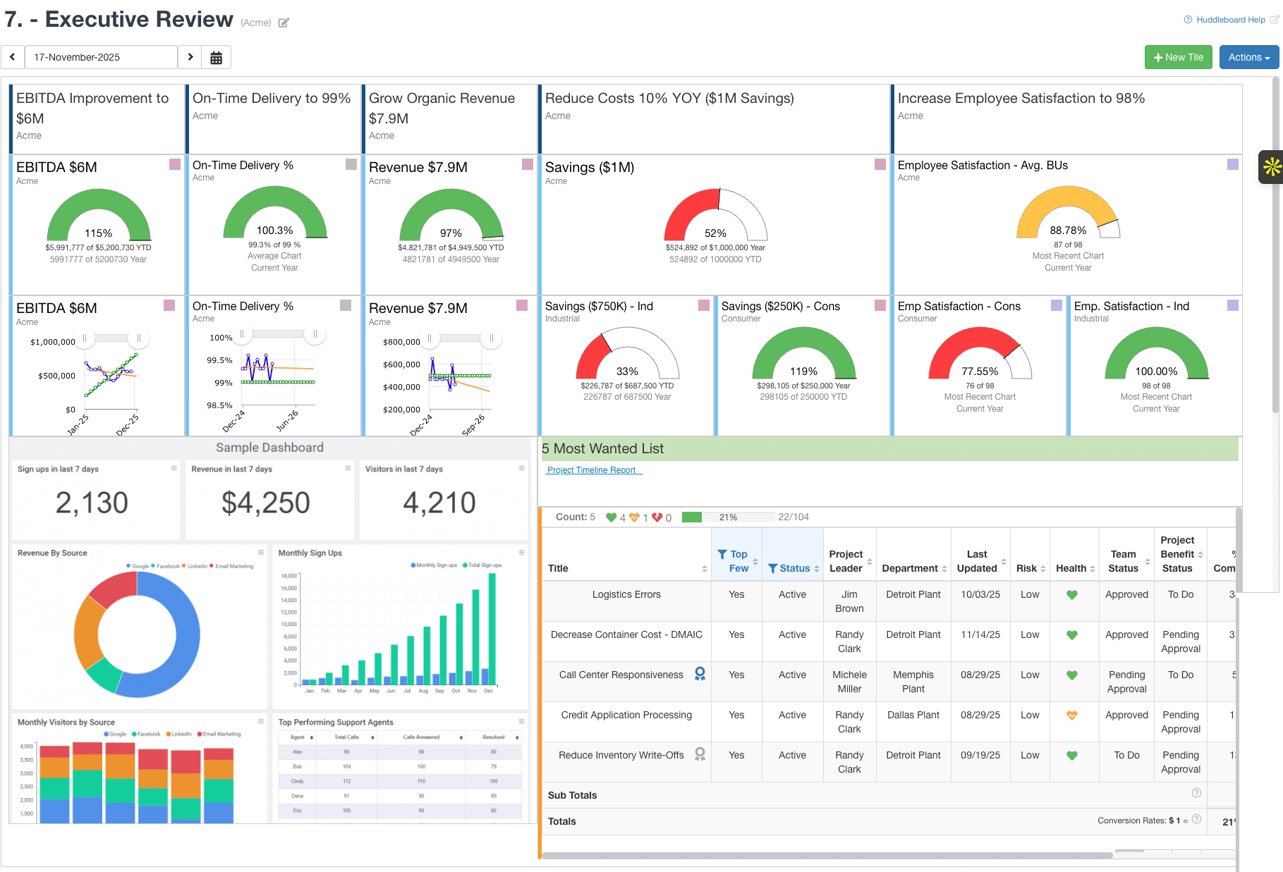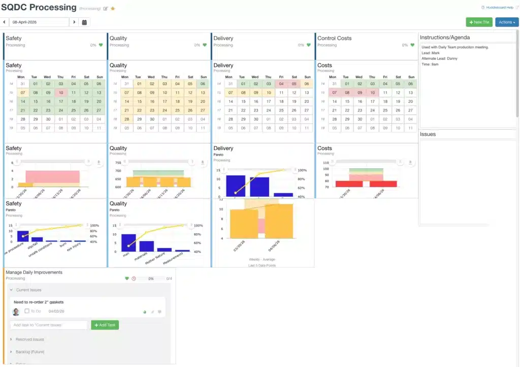 A Huddle Board is a visual management tool used by teams to review performance metrics, track improvements, identify issues, and align daily work with goals. Huddle boards are commonly used in manufacturing, healthcare, operations, Lean, Six Sigma, and Agile teams to improve communication and accountability.
