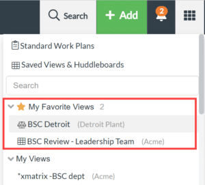- Saved views and huddleboards can now be marked as favorites and accessed under ‘My Favorite Views’ in the waffle menu.