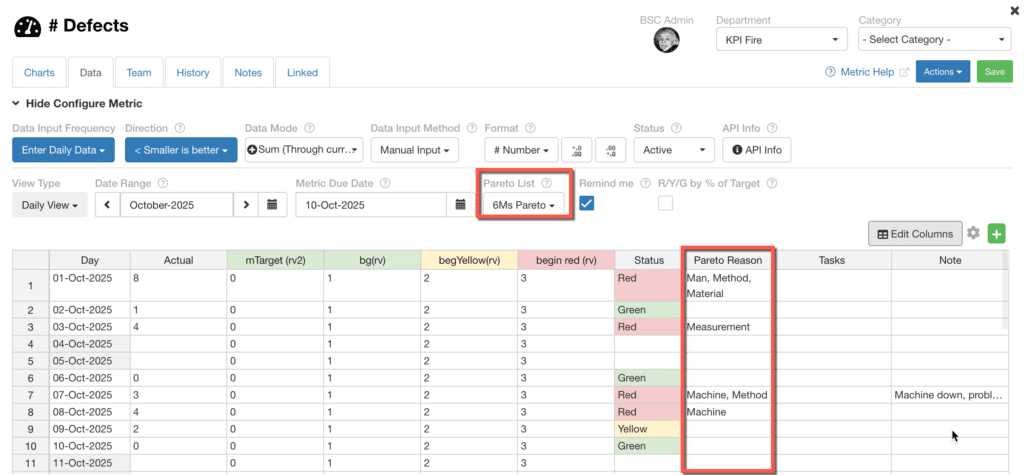Every Metric in KPI Fire includes a Reason Code column designed specifically for Pareto Analysis.